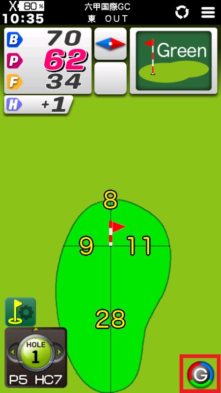 (2)[Gボタン]をタップで以下の「グリーンアンジュレーション」に切り替わります。
