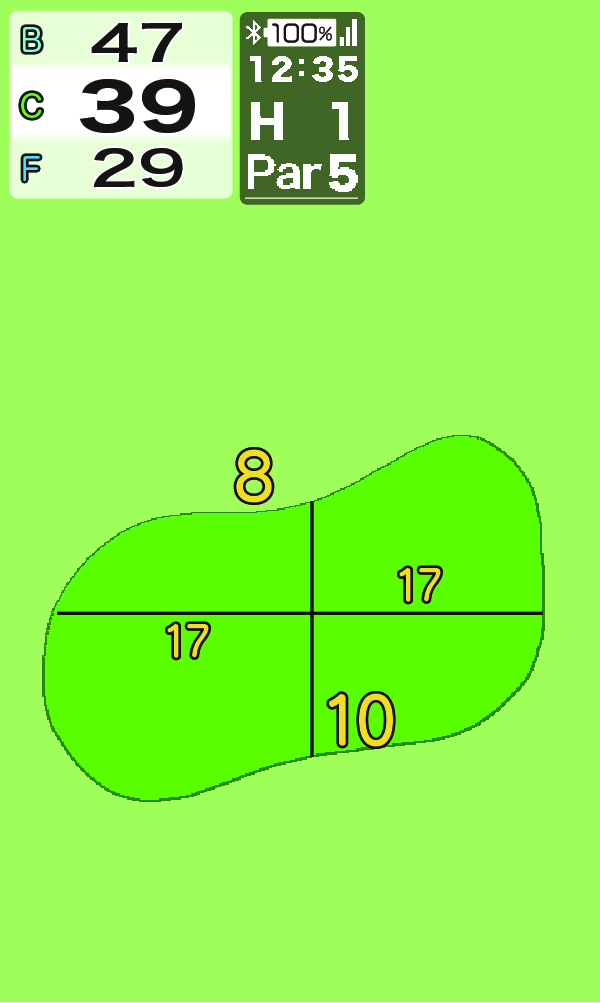 ⑥グリーンまでの残り距離が150y以内に近づくと「ベタピンナビ画面」に自動的に切り替わります。ベタピンナビでは、グリーンセンターまたはピンを中心にして、前後左右のエッジまでの距離がわかります。グリーンの落とし所を把握して、ピンに寄せていきましょう。